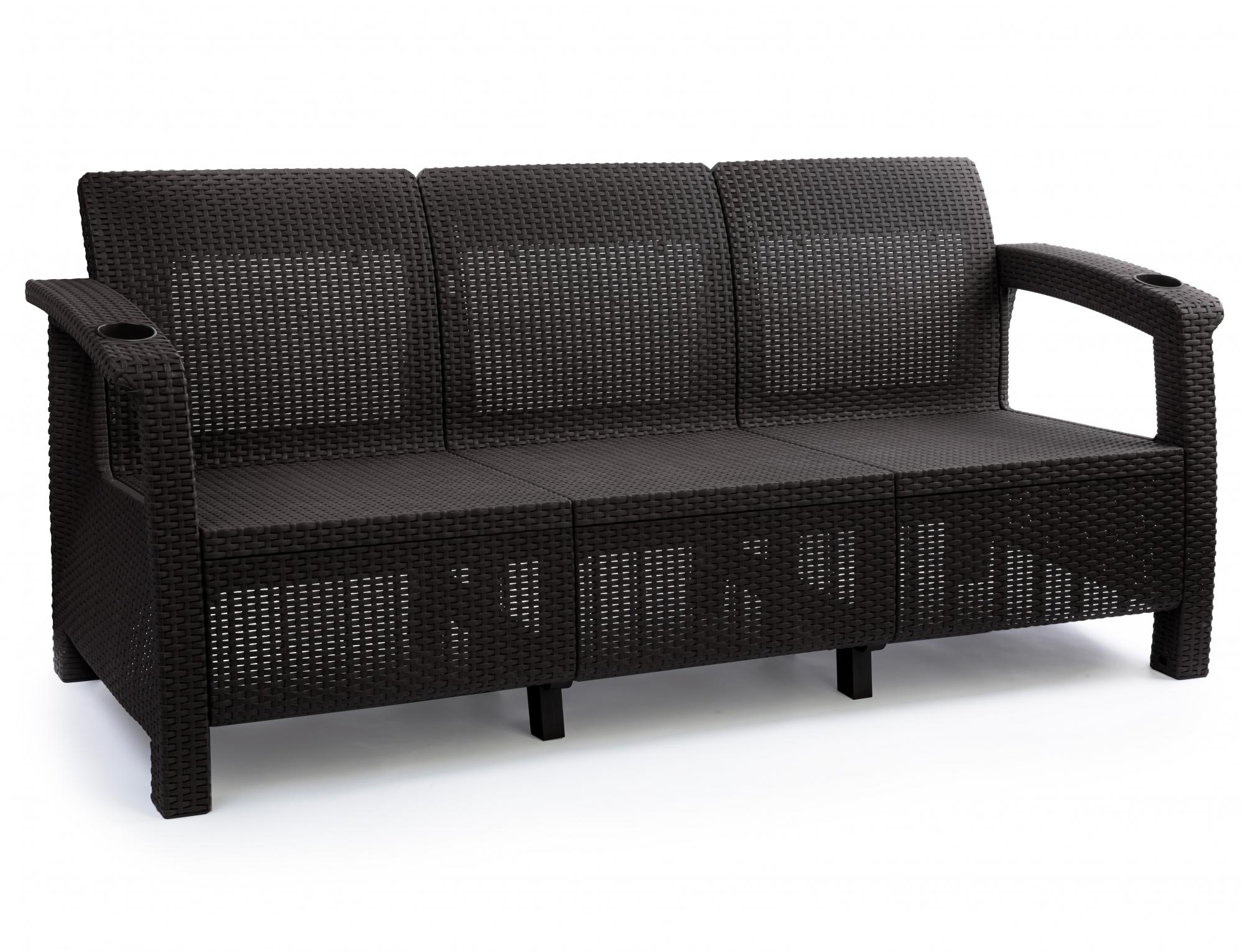Диван произведен из высококачественного полипропилена, имитирующего плетение из ротанга. Диван имеет три посадочных места, допустимая нагрузка на одно посадочное место - 106 кг (318 кг). На подлокотниках дивана расположены отверстия для напитков. Диван может стать идеальным решением по оформлению зоны отдыха в доме, на садовом участке, в офисном помещении или в кафе. Благодаря цветовым решениям, диван подойдет под любой интерьер. Диван упаковывается в индивидуальную упаковку, инструкция по сборке прилагается.Зону отдыха также можно дополнить журнальным столиком и креслами серии «Ротанг».