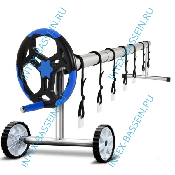 Сматывающее устройство с Т-образными опорами из нержавеющей стали на колесиках. Служит для удобства использования солярного покрытия. Удобная и прочная конструкция. С помощью эластичных шнуров (в комплекте) солярное покрытие прикрепляют к алюминиевой штанге (3 секции по 2,15м)