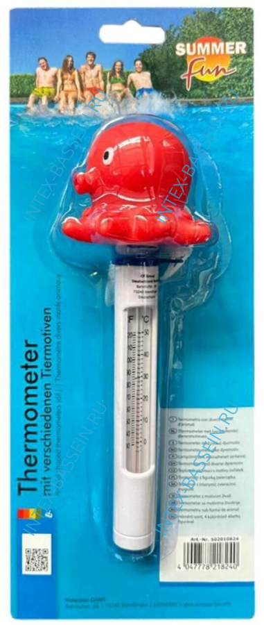 Плавающий термометр с игрушкой для бассейнов. Изготовлен из безвредного полимера, не содержит стекла, ртути или острых частей. Имеет две шкалы – Цельсия и Фаренгейта. Оснащен плавающим шнурком для крепления к стенке бассейна.